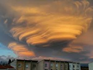 При залез слънце в небето там се появила тази сложна „структура“ от необичайни облаци, наподобяваща многослойна торта или летящи чинии. Става дума за удивителен и рядък природен феномен, наречен лентикулярни (лещовидни) облаци.