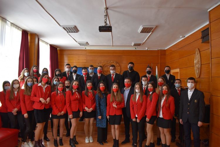 Посланик Херо Мустафа бе посрещната в училището за шампиони от директора Милко Багдасаров, председателя на Ученическия парламент Деница Георгиева и изявени ученици, а момичета в носии поднесоха пита и сол по стар български обичай. Кратката обиколка из училището я впечатли особено много – еврокоридора, кабинетите, колекцията от бухалчета от целия свят, красивите кътове във фоайетата, многобройните купи от състезания в науката и спорта.