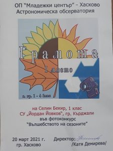 Селин Бекир от I a клас на СУ „Йордан Йовков“ се класира на първо място в първа възрастова група на Националния конкурс „Вълшебството на сезоните“ , организиран от ОП „Младежки център“ – град Хасково и Астрономическа обсерватория в раздел Фотоконкурс. Първокласничката, чийто класен ръководител е Росица Христова, бе наградена с грамота и чаша, на която…